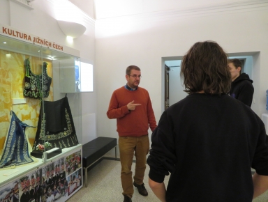 Dne 17. 12. 2025 navštívil dějepisný seminář dějin 20. století Jihočeské muzeum, kde nás národopisnou expozicí provedl absolvent našeho gymnázia PhDr. Jan Šimánek, který nyní působí jako etnograf této slovutné instituce. Svým poutavým vyprávěním nám přiblížil lidové tradice 1. poloviny 20. století, které mají však mnohem hlubší kořeny. Děkujeme za zajímavý a fundovaný výklad a těšíme se na další setkání, tentokrát na půdě naší školy již 6.února 2026 u příležitosti konání Noci mladých vědců, umělců a sportovců.